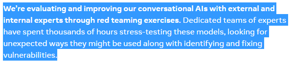 Grazie a questo esercizio, ho appreso degli sforzi di META nel costruire funzionalità di intelligenza artificiale generativa in modo responsabile e del loro impegno per la privacy. Tuttavia, alcune domande restano senza risposta e nel complesso, il mio entusiasmo non è migliorato molto. Sono giunto alla conclusione che la tendenza attuale (non limitata a META) di progettare chatbot con personalità e caratterizzazioni, potrebbe funzionare nella direzione opposta dei vari sistemi di filtraggio che vengono aggiunti a questi strumenti per limitare le interazioni indesiderate.