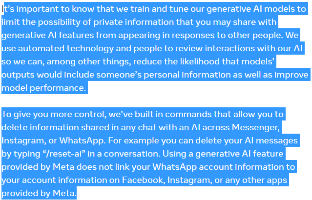 A marzo 2023, il Garante Privacy italiano ha bloccato ChatGPT, citando tra le cause la mancanza di trasparenza su come il sistema utilizzasse i dati delle interazioni degli utenti. Mentre è chiaro che META utilizzerà le informazioni degli utenti per ritraining del modello e migliorare il servizio, è ancora poco chiaro il livello di controllo (se esiste) che l’utente avrà sui propri dati dopo la raccolta. Il paragrafo unico che sono riuscito a recuperare sulla documentazione di META è riportato in Fig. 3b. Mentre la Fig. 3b fornisce consigli su come un utente potrà cancellare una chat, non c’è un’indicazione chiara di come i messaggi cancellati influenzeranno il modello. Ricorderà ciò che ha appreso da un’interazione dopo che l’utente l’ha cancellata? Quale controllo avrà l’utente sull’intero flusso di dati?