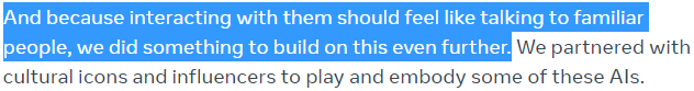 Apparentemente, l’obiettivo di questi personaggi è stimolare conversazioni con gli utenti per un’interazione più “immersiva”. Parlare con loro “dovrebbe sembrare di parlare con persone familiari”.