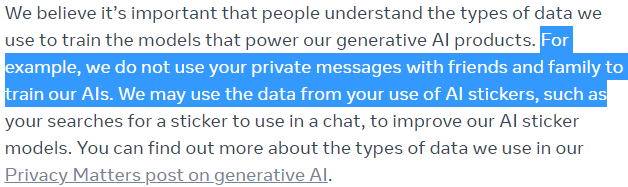 Come indicato sul sito Web META (e riportato nelle Figure 4a, 4b e 5), solo le interazioni dell’utente con il chatbot verranno utilizzate per riqualificare il modello. Pertanto, dovremmo aspettarci che tutte le domande o le conversazioni che avremo con il chatbot vengano condivise per migliorare il modello.