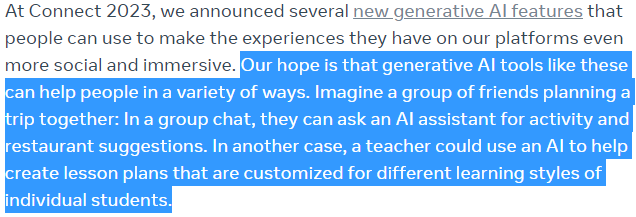 Come dichiarato da META (Fig. 2), gli assistenti virtuali sono stati sviluppati per dare l’impressione che interagiremo con “persone familiari”. Questo si traduce nell’obiettivo di avvicinarsi il più possibile alla vita dell’utente per stimolare conversazioni intime e interazioni durature. Considero ciò estremamente pericoloso.