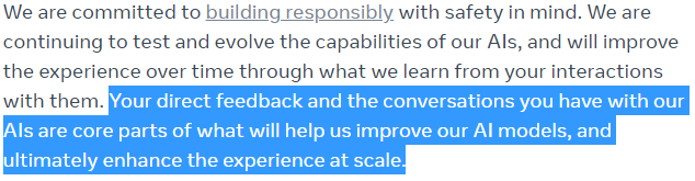Le conversazioni tra utenti, familiari e amici rimarranno private ed criptate. I messaggi scambiati con il “Personaggio” potrebbero essere utilizzati per migliorare il servizio, ovvero per riallenare il modello di intelligenza artificiale.